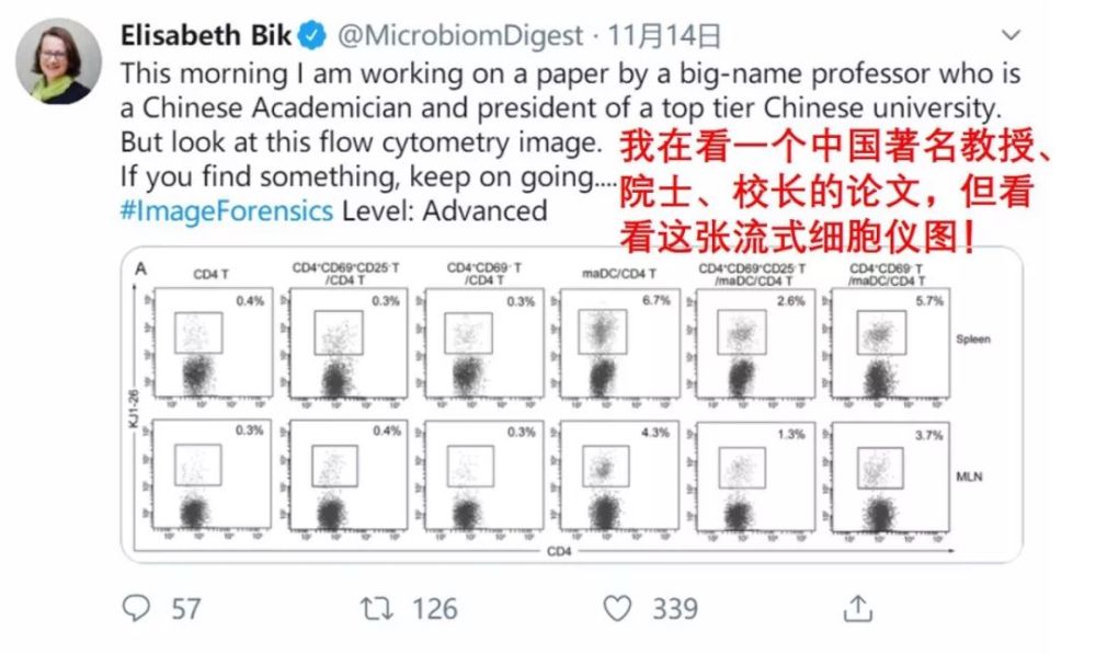 事情起源于11月14日,美国生医领域学术打假专业户Elizabeth Bik在推上表示,发现某中国大牛的论文图片有问题。她讲得很隐晦,没有点名。