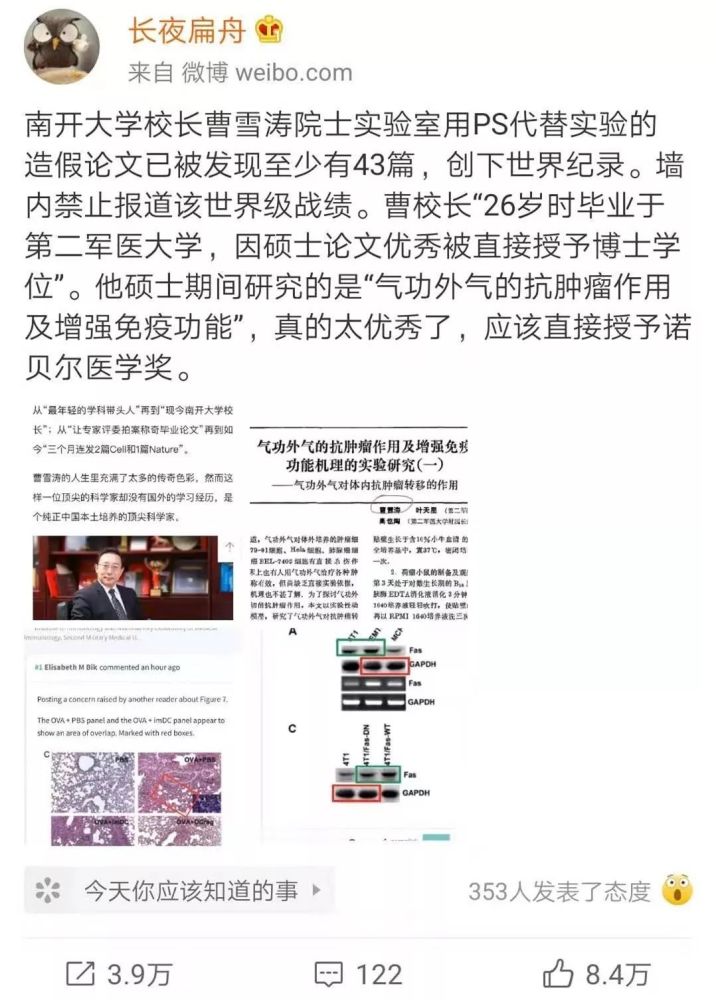 随后我国打假专业户方舟子直接点名:此人是南开大学校长曹雪涛院士,有18篇论文被发现数据造假。