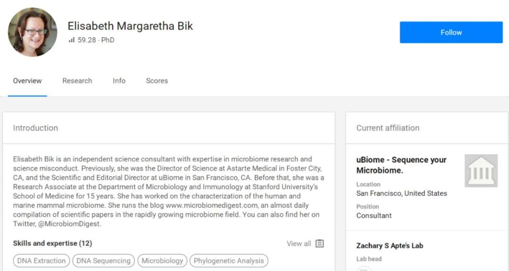 Elisabeth是微生物和免疫领域的博士,早年在斯坦福搞了15年科研,2016年辞职专门搞学术打假[1]。