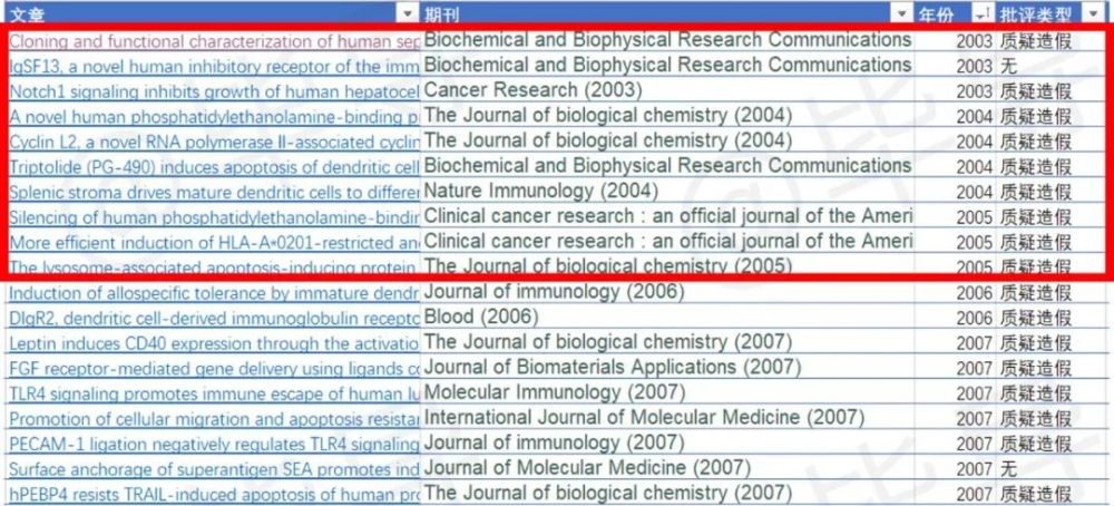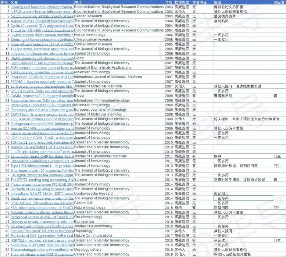 我上pubpeer统计了目前全部被锤的paper,记录了期刊名、发表年份、被质疑的问题、曹组同学的回应。展示如下: