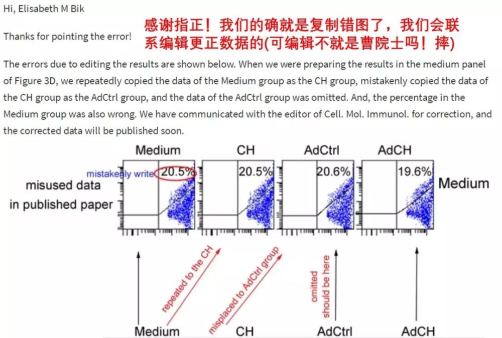大概意思是:Bik博士,那些paper的确是我发的。我已经把这件事列为最高优先级,仔细检查我们的原始数据和实验记录。如果调查发现有任何问题,我们会和期刊合作处理。但我对我们成果的有效性、重现性充满信心!我的确监督疏忽,这没有任何借口。我将利用这一宝贵的学习机会,不仅在推进科学方面做得更好,而且在维护科学的准确性和完整性方面也会做得更好。